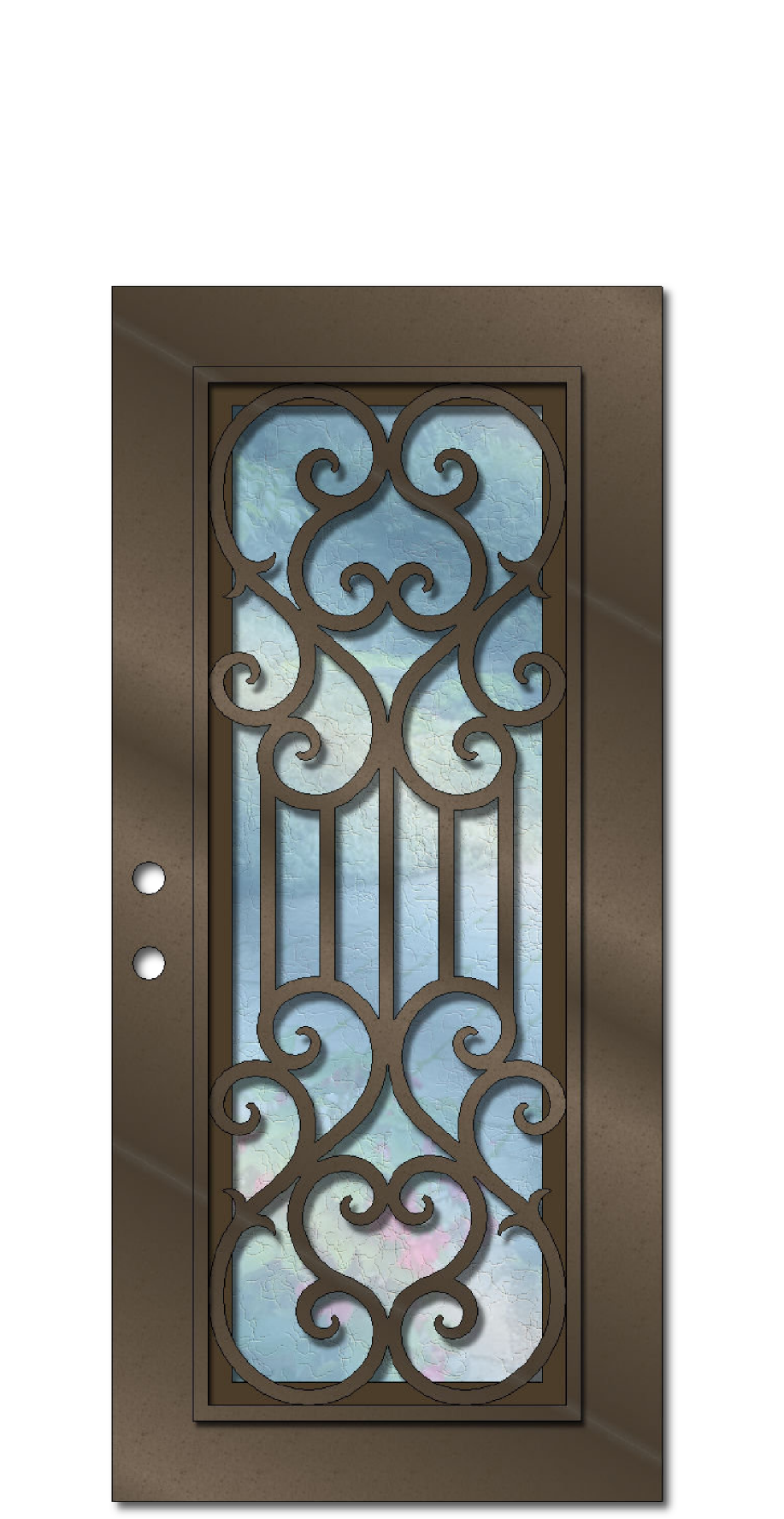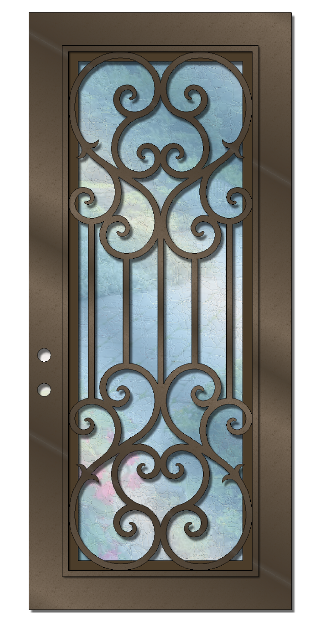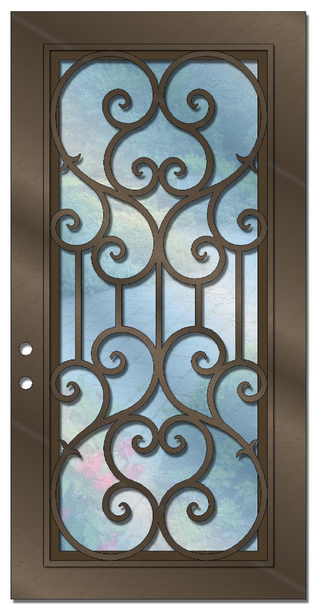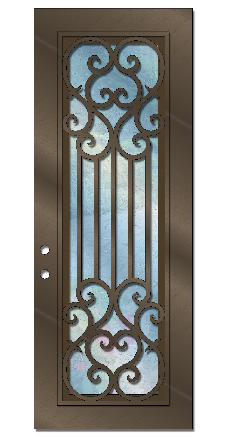 The example photo shown is of a 3' X 8' Amante. It is powder coated Copper Vein and has Rain glass. However, when ordering you will be able to choose your preferred powder coat color & glass texture along with one of the 4 door size (seen below) you require.