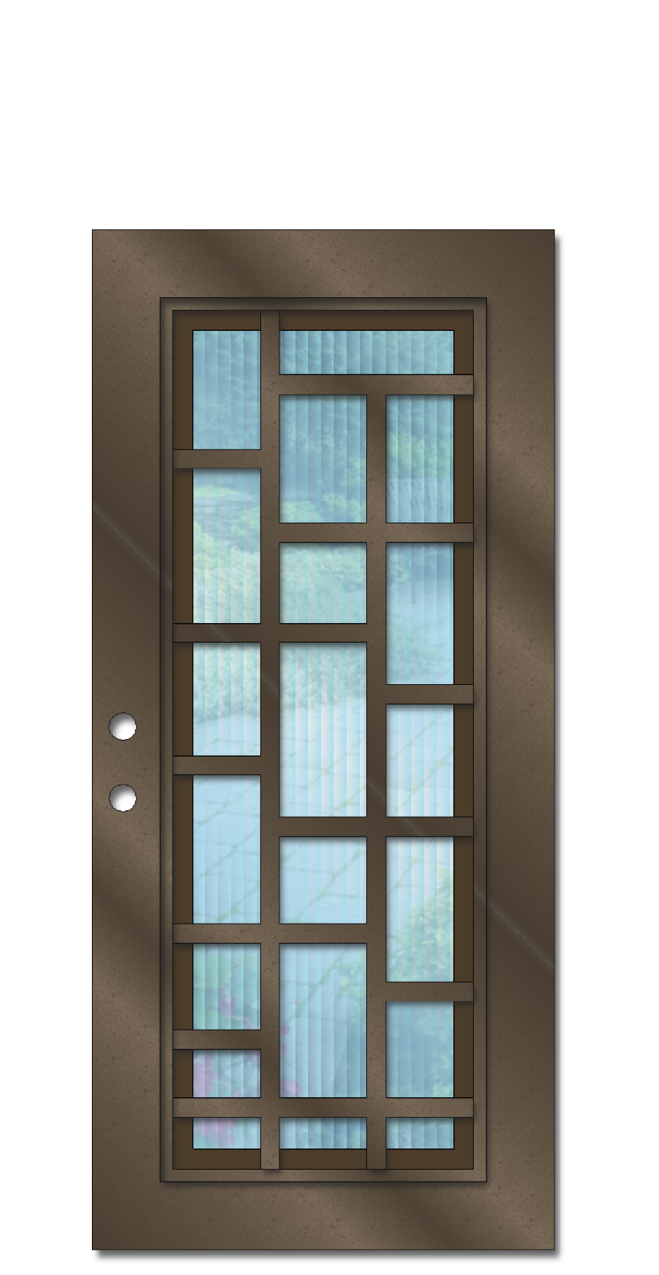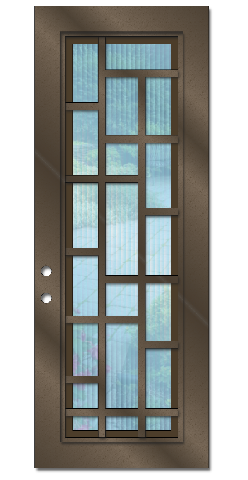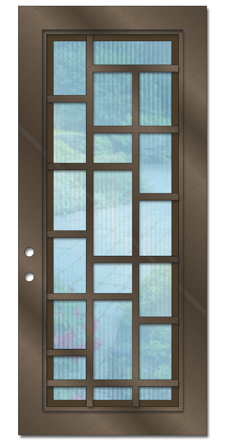 The example photo shown is of a 3' X 8' Rochester. It is powder coated Black and has Glacier glass (glass discontinued). However, when ordering you will be able to choose your preferred powder coat color & glass texture along with one of the 4 door size (seen below) you require.